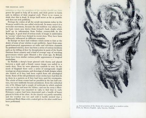 Intriguingly, where English does show up is in the literature of modern pagan witchcraft, including sleuth-style websites and more academic sources. The fullest account is given by Michael Howard, a respected practitioner of ritual magic and author on esoteric topics. From 1976 until his death in 2015, Howard was editor of The Cauldron, an international magazine on witchcraft, Wicca, ancient and modern paganism, magic, and folklore.53 Howard’s 2004 article on English, titled “A Very English Witch”, begins by noting that one of her pencil and charcoal drawings, of the Greek god Pan, was reproduced as a plate in Cottie A. Burland’s 1966 study of “magical practice today”, The Magical Arts (fig. 33).54 Burland is an intriguing character: employed as curator in the Department of Ethnography at the British Museum, he published widely on the pre-Hispanic culture of Latin America and so-called “primitive art”. As well as being a member of the Royal Anthropological Institute, he was a member of the British Society of Aesthetics and was a regular contributor to Art Review.