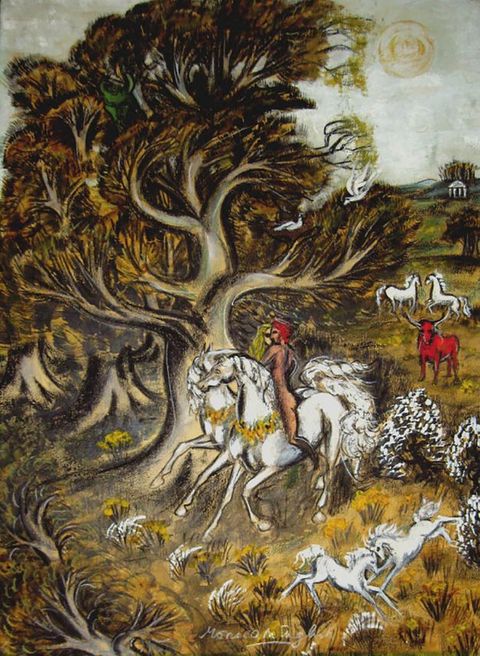 59a painter of two worlds. One of these was a world of myth and legend peopled with the gods, warriors and ghosts of the past, and springs from her study of anthropology, folklore and primitive religions. The other world is the rural reality of landscape and animals, particularly horses, whose beauty and pride of movement fascinates her.59