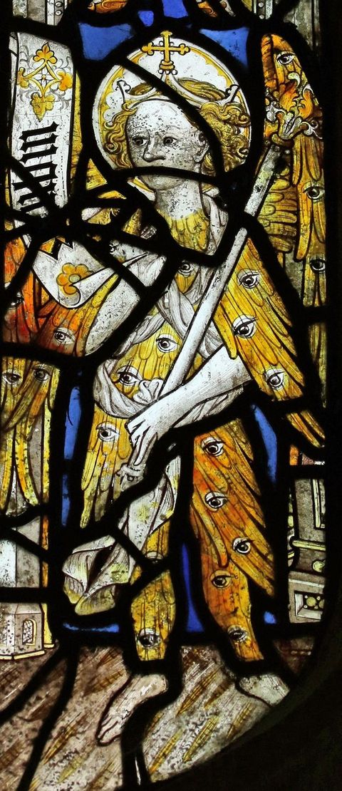 63Objects linked to the Reformation and the dissolution of the monasteries were sourced by Metzger from the great abbeys of the eastern region. A 25 1/2 inch long stone “Cover of Heart Burial”, a loan of Wisbech Museum and Literary Institute, was the work of a mason from Crowland Abbey, legendary residence of Hereward the Wake, leader of the local resistance to the Norman Conquest, later fortified and garrisoned by Royalists but besieged and destroyed by Protestant forces. Objects number 20 and 22 came from the Abbey of Bury St Edmunds, once among the richest Benedictine monasteries in England: “Stained Glass Window … constructed of fragments … includes representations of Edmund as the Boy King and Martyr; one of the Magi (wearing turban…); St. Thomas à Becket (…with aureole and pierced by a sword) and other ecclesiastical and militant figures”. Accompanying it was “The Angel of St Matthew. Stone. 29 1/2” high. Possible one of the four symbols of the Evangelists which formed part of a doorway at the Abbey of St. Edmund about 1130–40."
