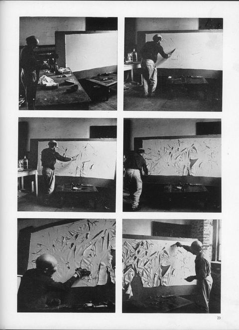 Metzger drew on all of his resources to make the exhibition happen. In late summer 1944, he had a chance meeting with Paolozzi at the Ashmolean Museum, Oxford (earlier that summer Metzger had made the decision to become a sculptor instead of a professional revolutionary). Still a student at the Slade, Paolozzi invited Metzger to visit the art school where he met his peers Nigel Henderson and William Turnbull. Hatwell studied at the Slade several years after Paolozzi and Turnbull; but met Metzger in David Bomberg’s Borough Polytechnic classes of 1945–1946 and became a fellow member of the Borough Bottega.
