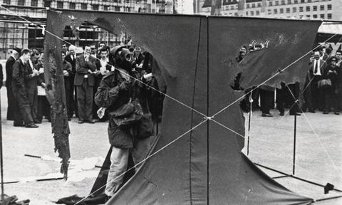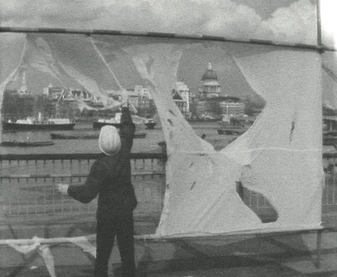 The celebrated artist-activist Gustav Metzger made his iconoclastic—and iconic—entry into post-war public life in Britain with his Recreation of First Public Demonstration of Auto-Destructive Art on London’s South Bank in 1961. First demonstrated a year earlier at Temple Gallery, Sloane Street, film-maker Harold Liversidge’s 1963 documentation of a recreation, titled Auto-Destructive Art: The Activities of G Metzger, shows Metzger, wearing a military jacket, helmet, and gas mask, painting, flinging and spraying acid onto nylon (figs. 1 and 2). Set against the backdrop of the City of London, it announces Metzger’s focus as an itinerant cosmopolitan artist: the centralised seat of imperial capitalist power. Yet, it was in King’s Lynn, in the rural county of Norfolk, where he lived from 1953 to 1959, that Metzger first experimented with what would become the “auto-destructive” technique in his live-work-warehouse studio on St Nicholas Street at the heart of the medieval old town.