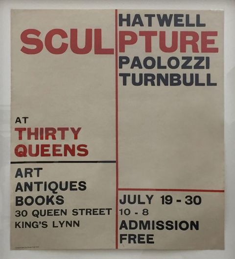 The exhibition, Sculpture at Thirty Queens, featuring recent works of Eduardo Paolozzi, William Turnbull, and Anthony Hatwell, was arranged to mark the opening of Gustav Metzger’s art, antique, and bookshop at 30 Queen Street on 19 July 1956. The exhibition opening coincided with the launch of the annual King’s Lynn Festival, although, unlike Treasure from East Anglian Churches the following year, it was not part of the official programme. Open daily from 10 a.m. to 8 p.m. until 30 July, admission was free. Thirty Queens was, as a commercial venture, a total failure; nonetheless, of the three displays he hosted there throughout 1956, he considered Sculpture at Thirty Queens the “principal exhibition”.30