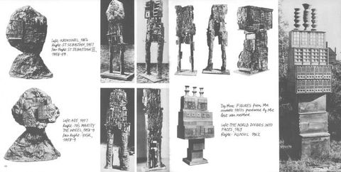 32All of Paolozzi’s works exhibited at Thirty Queens were produced in 1956. Although there is no known itemised list, of those named in the press release Small Figure was also exhibited at the Hanover Gallery (fig. 16). As the Hanover exhibition occurred at the same time as This is Tomorrow—9 August until 9 September—then it would seem Paolozzi’s figures had their first display in King’s Lynn. It was the tension of the Paolozzis that appealed to Metzger: “In '56 he was homing in on destruction, violence. It was new work of the lost wax process. Full of violence. Terror. What appealed was the distortion and destruction.”34 The only two other works named in the press release are Head Looking Up, “an image of a man battling with indomitable will against a mechanical hostile environment”, and Black Figure, “made up of steel girders against which life struggles – barely triumphant” (fig. 17).35 A sense of the disturbing presence of the gathered “Figures” is conveyed in the spread of Frank Whitford’s later 1971 Tate catalogue on Paolozzi (fig. 18).36