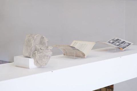 12Our display at LOWER.GREEN in February 2019 was intentionally slight, featuring one object—a thirteenth-century stone corbel selected by Metzger for Treasures from East Anglian Churches—and documents—including the original exhibition catalogue, an early edition of his first auto-destructive manifesto reproduced in dé-collage no. 6, July 1967, a special “Auto Destructive” art issue, and John Cox’s 1959 sequence of photographs of Metzger in his studio at St Nicholas House, reproduced in the Art and Artists “Auto-Destructive” issue, edited in 1966 by the art critic Mario Amaya (fig. 5).