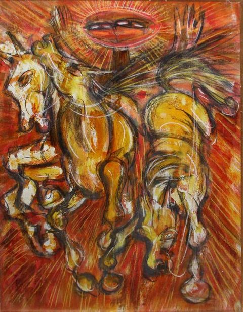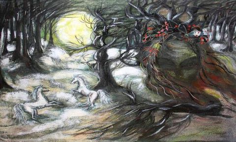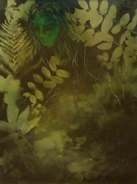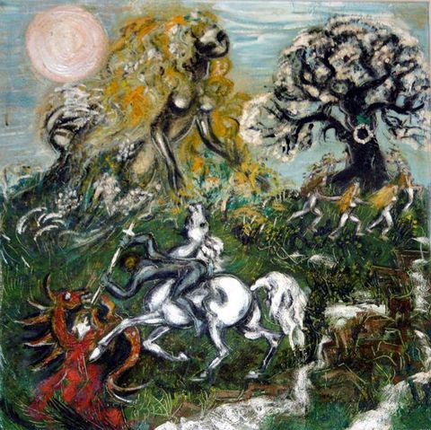 59a painter of two worlds. One of these was a world of myth and legend peopled with the gods, warriors and ghosts of the past, and springs from her study of anthropology, folklore and primitive religions. The other world is the rural reality of landscape and animals, particularly horses, whose beauty and pride of movement fascinates her.59