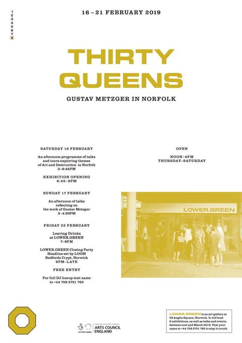LOWER.GREEN’s programme provided exhibition opportunities for Norwich-based and international artists, typically developing and amplifying thematics presented by histories of the region as they interfaced with current concerns of contemporary art. Networked, experimental and engaged with local histories, Metzger’s Thirty Queens was an inspiration. While Metzger’s own art practice was cross-disciplinary—collapsing activist into dealer, dealer into curator—the site of production, framing, and display of art were fluid and interchangeable too. This mixed-economy model (not strictly non-commercial) of artistic production and distribution is an unusual and useful model to rethink British art of the 1950s, decentring attention from London to consider venues, spaces, and practices of experimental art operating outside of the capital. Metzger’s work in King’s Lynn spoke to our situation in complex and suggestive ways.
