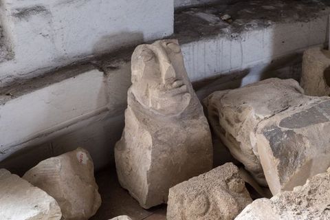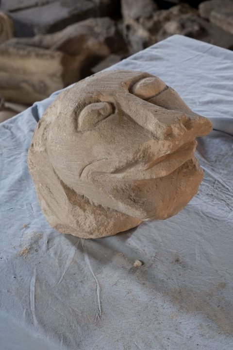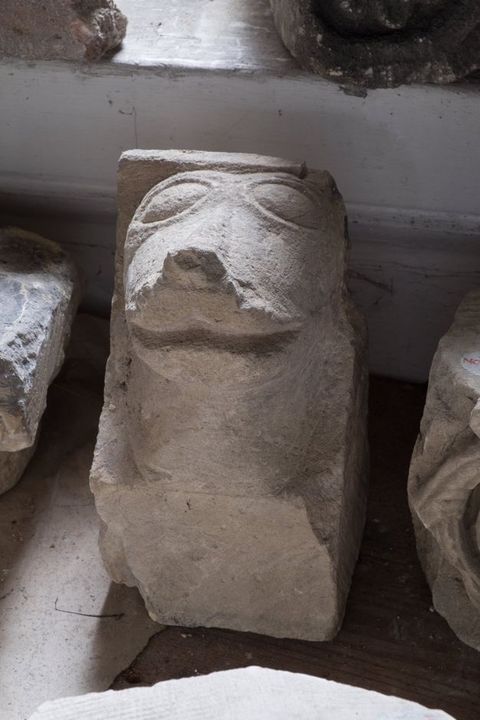 Glass was loaned to Metzger by individual churches, Stratton Strawless, Norfolk and Baningham Church, Norfolk (incorrectly listed as Bannington in the original catalogue), and Norwich lead glaziers G. King & Son from a variety of locations (figs. 39, 40, 41, 42, 43, 44, and 45). The family firm of G. King & Son has not existed for some years now, but the son of its co-founder, Michael King, a medieval glass specialist, explained that Metzger’s selection almost certainly would have consisted mostly of glass under restoration in the workshop at that time and would have been returned to the buildings they came from on completion of the work (which sometimes took a number of years). While Michael was unable to identify with certainty all of the pieces based on Metzger’s description, he suspected that some were part of the collection his uncle was assembling in order to make the Erpingham window in Norwich Cathedral, completed in the early 1960s (fig. 46). While glass was offered by Reverend Christopher Engelsen of Stratton Strawless, the practicalities of employing a glazier to remove the fragments was beyond our means.76 Likewise, the practicalities of borrowing the nine grotesque corbels Metzger had been loaned from Norwich Cathedral proved impossible (figs. 47, 48, 49, 50, 51, and 52). However, viewing the objects, the librarian and curator at the cathedral noted that they were not subject to damage at the time of the Reformation as Metzger had supposed.