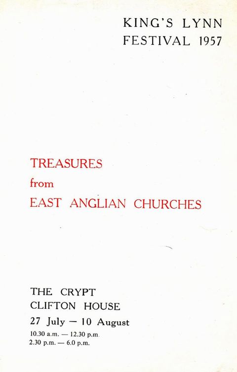 The exhibition Treasures from East Anglian Churches opened on 27 July 1957 at the crypt of Clifton House, 17 Queen Street. Part of the sixth annual King’s Lynn Festival programme, it remained open until 10 August (fig. 34). For this exhibition, Metzger assembled an antiquarian catalogue of thirty-six objects loaned by regional churches, institutes, museums, and private companies that had been damaged, removed, or displaced in the period between the Reformation and the end of the Commonwealth.